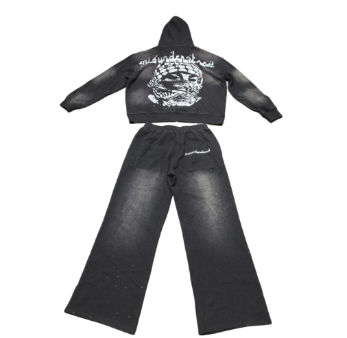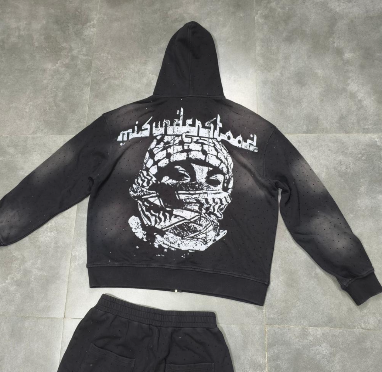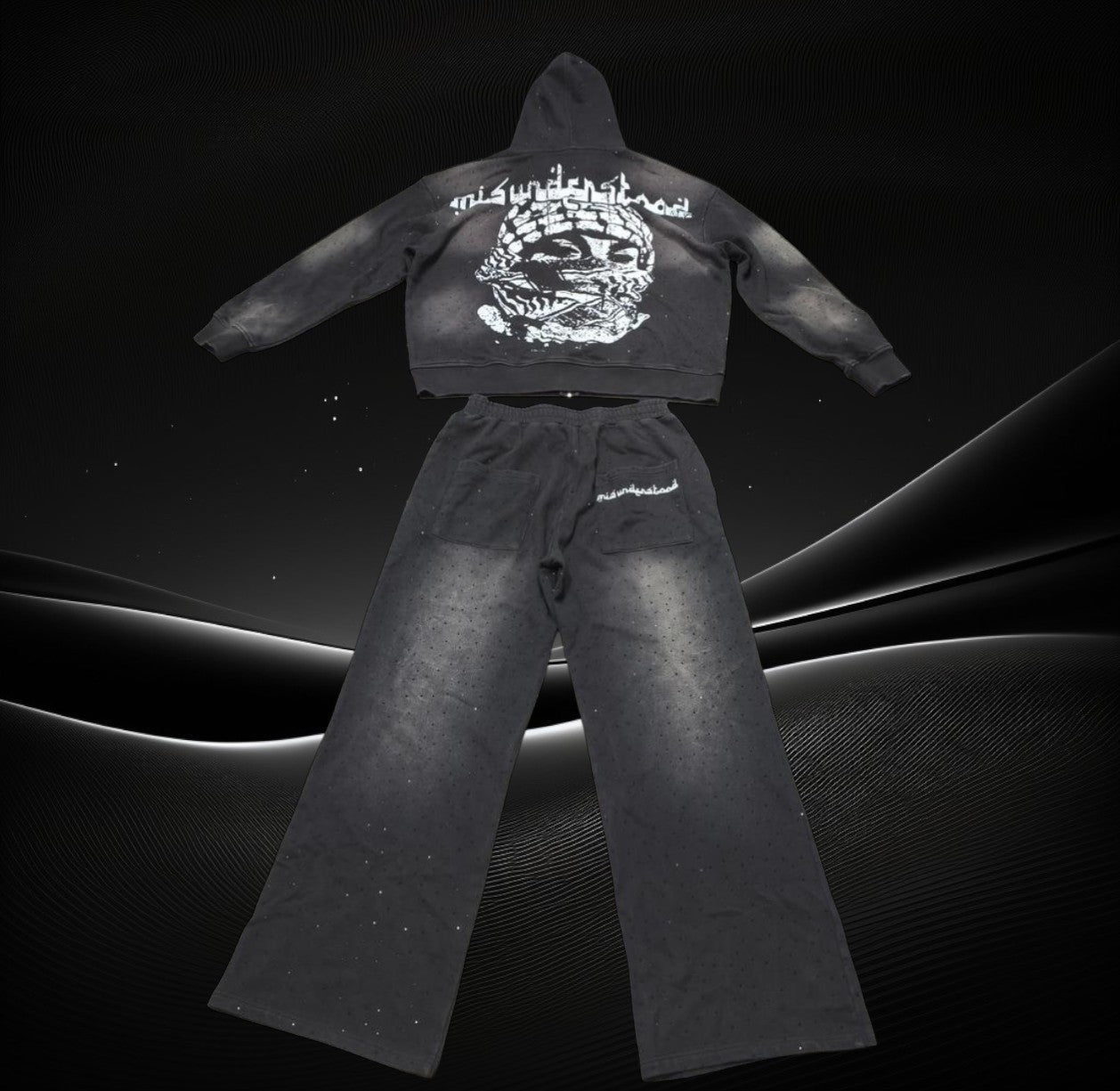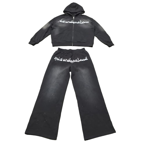Make a bold statement with this matching hoodie and pants set featuring the striking “Misunderstood” branding. Designed for those who aren’t afraid to stand out, this set blends streetwear aesthetics with comfort. The oversized back graphic, paired with subtle shimmer details throughout, creates a confident, edgy look perfect for casual wear or standout street style.